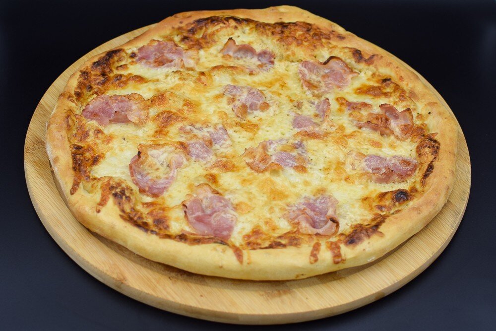 Тонкое тесто, соус карбонара, бекон, пицца 30 см