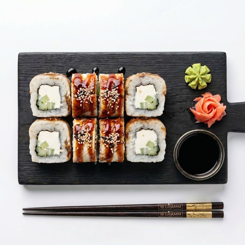 Рис, нори, угорь, творожный сыр, огурец, соус унаги, кунжут