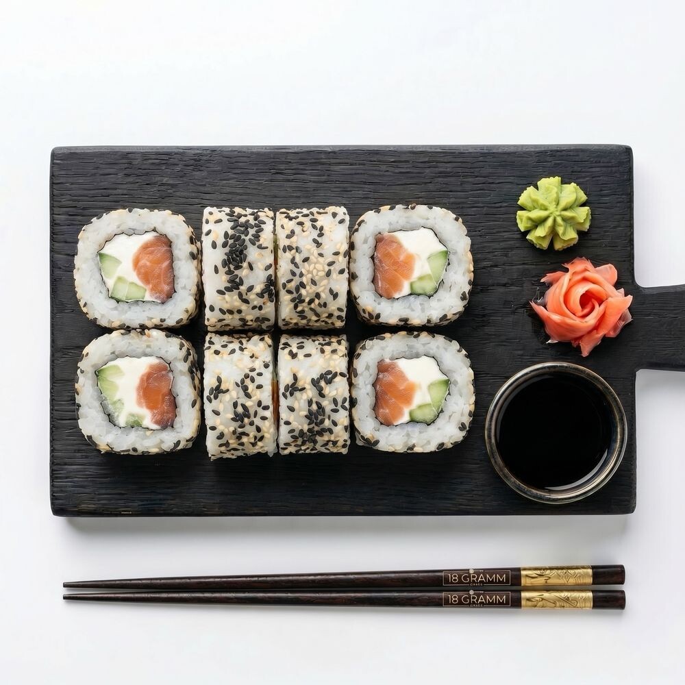 Рис, нори, творожный сыр, огурец, лосось, кунжут