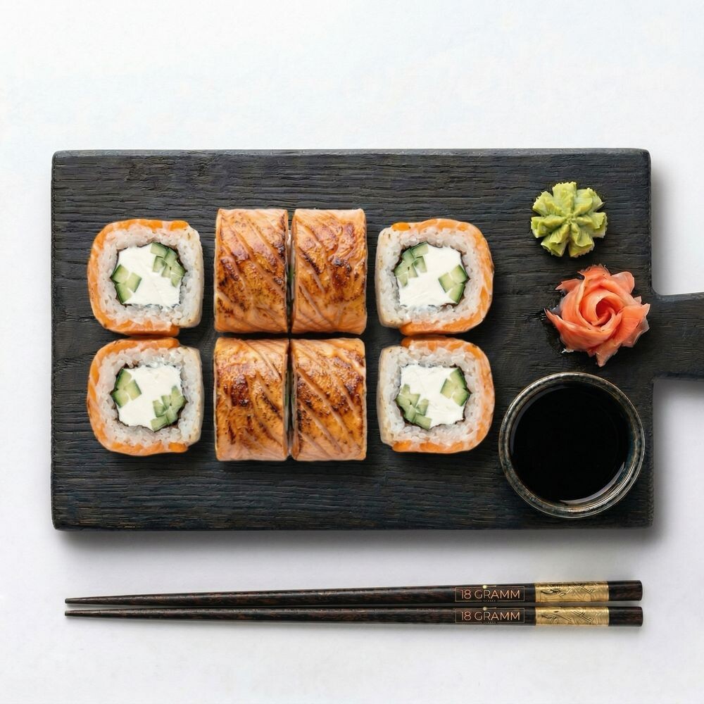 Рис, нори, творожный сыр, огурец, лосось опаленный