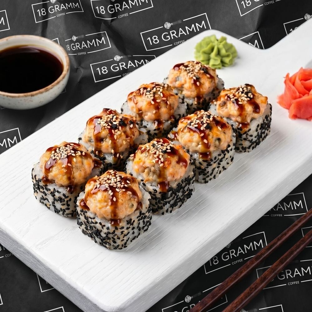 Рис, нори, творожный сыр, огурец, шапка из угря, спайси соуса, соуса унаги и кунжута